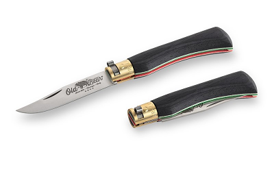 Η λαβή του πτυσσόμενου μαχαιριού είναι κατασκευασμένη από αρίστης ποιότητας πολυστρωματικό ξύλο ενώ τρείς διαμήκεις στρώσεις στο μεσαίο τμήμα της λαβής είναι χρωματισμένες με τις αποχρώσεις της Ιταλικής σημαίας (πράσινο, λευκό και κόκκινο) με μη τοξικές χρωστικές ύλες.