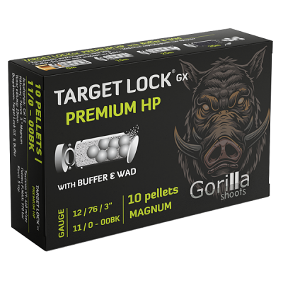 Φυσίγγια Δράμια Gorilla Target Lockgx Premium With Buffer & Wad 10Βολο Magnum 10βολο MAGNUM με δράμια 11/0 – 00ΒΚ, συγκεντρωτήρα και Buffer, το φυσίγγι που δεν δέχεται αμφισβήτηση σε κατανομή, διάτρηση και ταχύτητα. Χαρακτηριστικά : ΔΙΑΜΕΤΡΗΜΑ : CAL 12 Κάλυκας : 76mm 3΄΄ Magnum Τύπος Κάλυκα : 25mm Βυσμάτωση : Target Lock GX & Buffer Ταχύτητα V1 : 440 m/sec Πιέσεις P.MAX : 970 bar Κουτί : 5 τεμάχια
